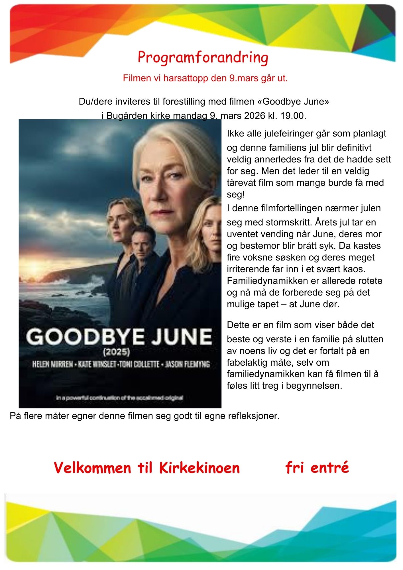 Denne gang viser vi filmen "Goodbye June" i Bugården kirke