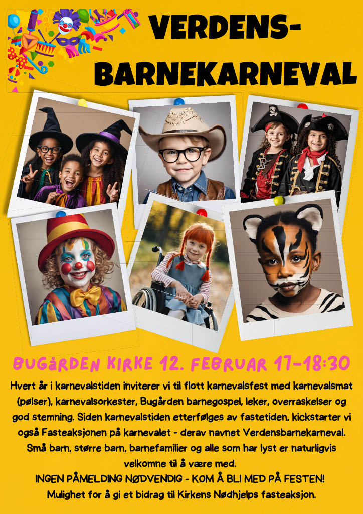 Hvert år i karnevalstiden inviterer vi til flott karnevalsfest med karnevalsmat (pølser), karnevalsorkester, Bugården barnegospel, leker, overraskelser og god stemning.